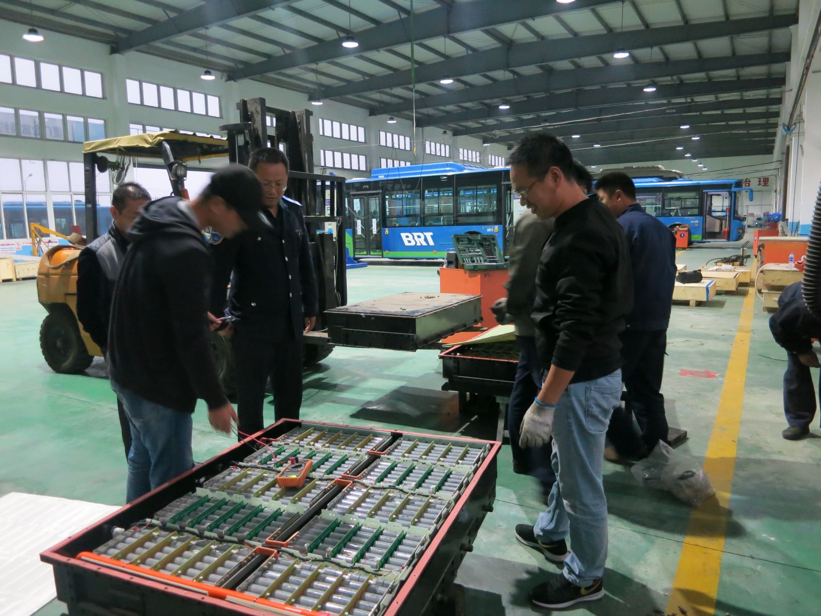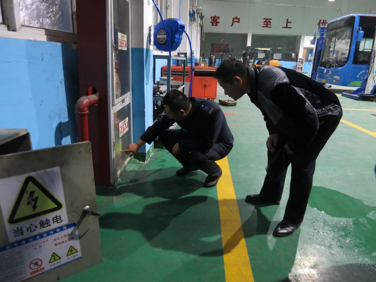 檢查過程中,由公交集團機務技術部部長、公交集團汽服公司經理趙玉軍帶領相關人員,對公司車間的消防器材、舉升機、用電、用氣情況進行檢查,對檢查出來的安全隱患要求負責人現場解決,不能現場解決的安全隱患記錄在冊,限時解決并擇期復查,趙玉軍詢問了修理工的作業進度,并對他們進行安全交代,要求他們嚴格遵守操作規程,做好安全防范工作。