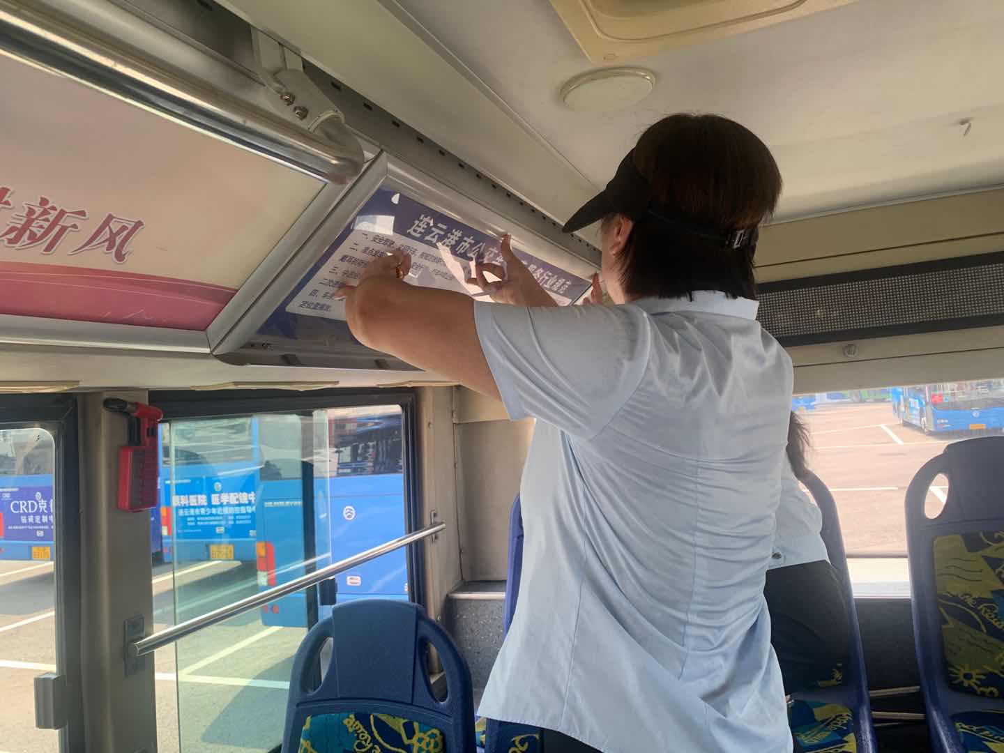分公司管理人員不懼炎熱,將車內(nèi)展板更換上“文明行為規(guī)范”,讓乘客在乘車的同時(shí)文明思想意識(shí)得到提高,爭做文明人,共創(chuàng)文明港城。