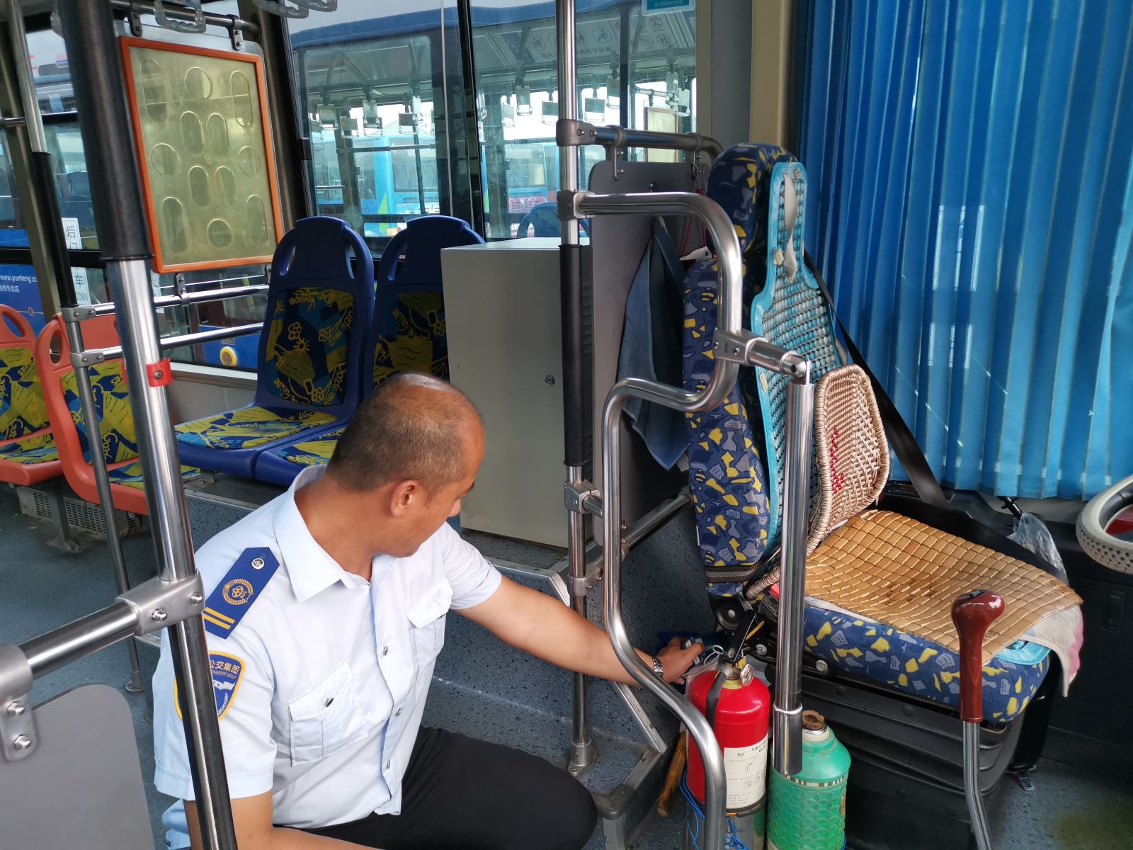 駕駛員抽出空隙時(shí)間打掃車輛衛(wèi)生,汗水浸透了衣衫,只為給乘客提供一個(gè)舒適整潔的乘車環(huán)境,使乘客出行乘坐公交時(shí)能有一份好心情。